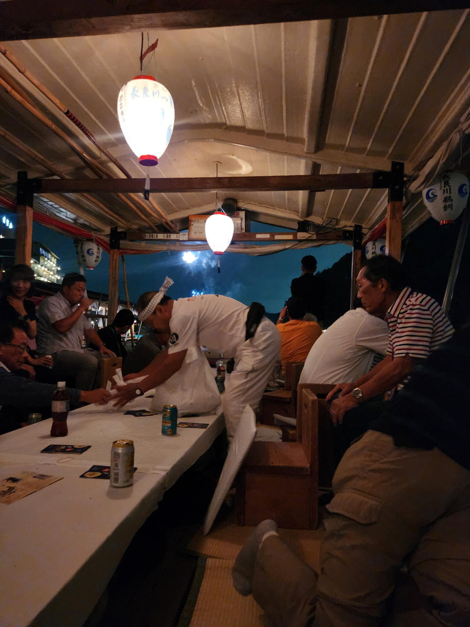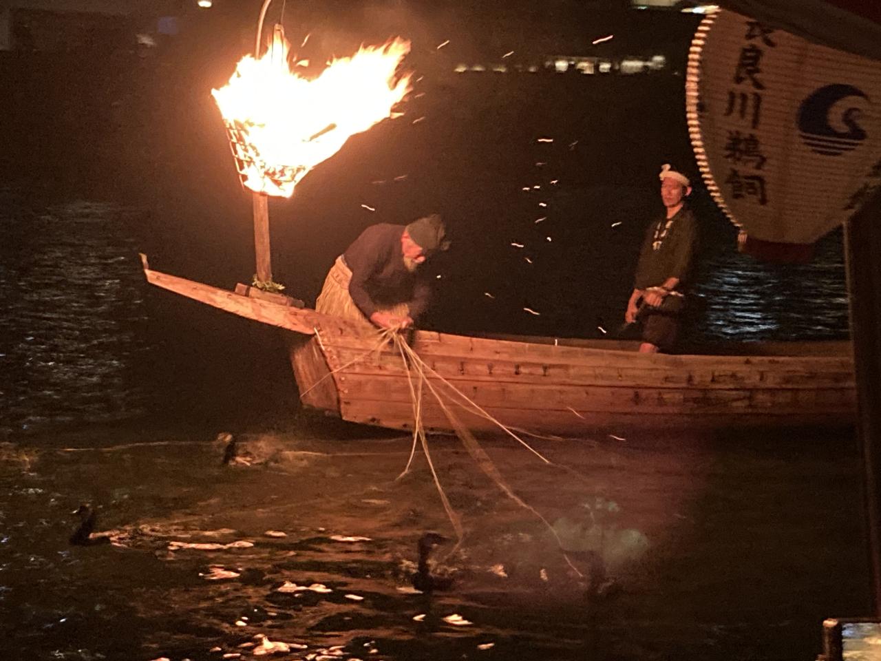 その後観覧船に乗り、まずはおいしいお酒とお弁当に舌鼓をうち、会員同士のお話に花が咲きました。辺りがすっかり暗くなるころに、いよいよ鵜飼が始まりました。漁火が真っ黒な水面を照らし、鵜匠さんたちの乗った数隻の小舟が観覧船の眼の前にやってきます。手縄に繋がれた鵜たちが時折潜って鮎を飲み込みながら、川面をスイスイと泳いで行きます。たいへん幻想的な光景につい見とれてしまいました。会員の皆さんも時折歓声をあげ、口々に感嘆の声を漏らしていました。